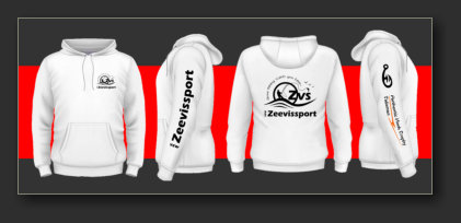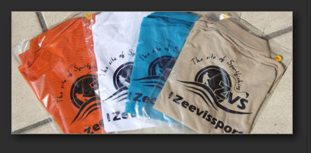 met Zeevissport logo op de rug en borst zijde. De T-shirts worden gemaakt naar kleur en maatvoering.
